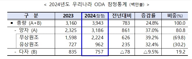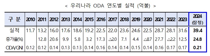 □ 경제협력개발기구(OECD) 산하 개발원조위원회(DAC)가 16일(한국시각 22:30) 발표한 공적개발원조(ODA) 잠정통계에 따르면 ’24년도 우리나라 ODA 실적은 전년 대비 7.8억불(24.8%) 증가한 39.4억불로 나타났다.