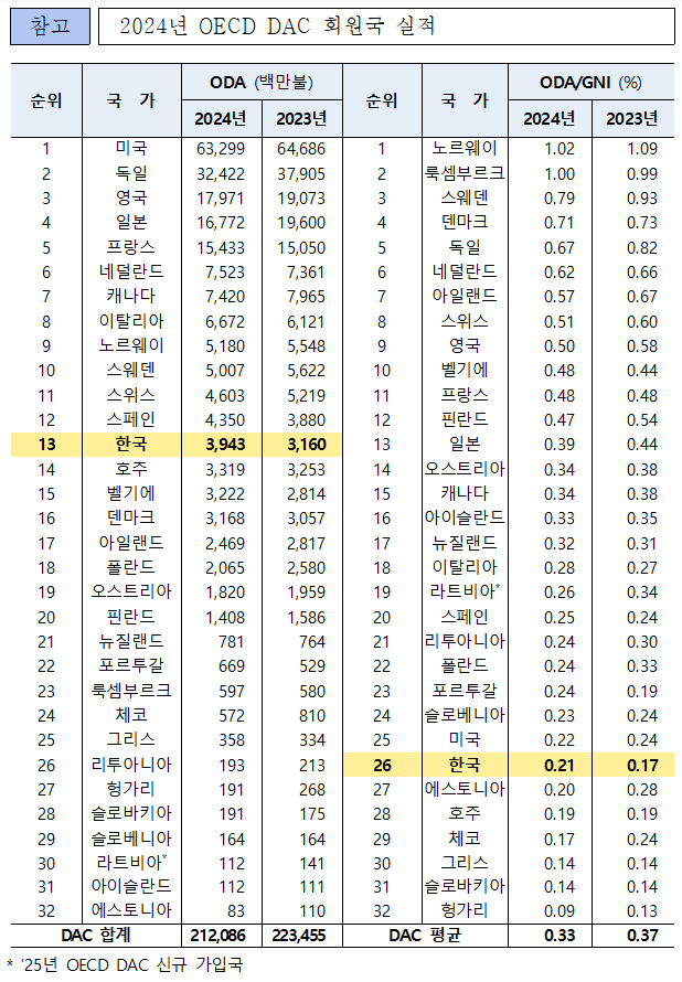 □ 전체 32개 회원국 중 우리나라 지원 규모 순위는 전년(14위)대비 상승한 13위로 나타났으며, 경제규모 대비 ODA 지원 규모를 나타내는 국민총소득 대비 공적개발원조(ODA/GNI) 비율은 0.21%로 전년에 비해 0.04%p 증가하여 26위를 기록했다.
